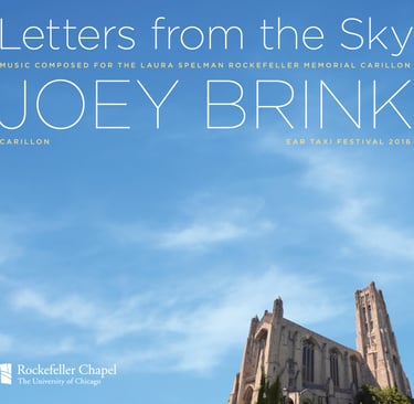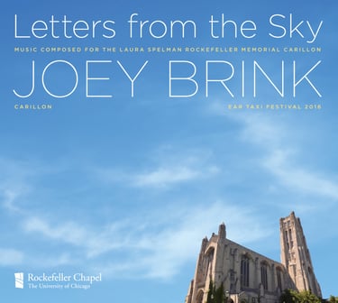 Music composed for the Rockefeller Memorial carillon, from 1936 to 2016, performed by Joey Brink. Includes historic compositions Chaconne by Easley Blackwood, and Fantasy by Roy Hamlin Johnson, as well as three new pieces composed for the 2016 Ear Taxi Festival in Chicago, including Brink's title track, Letters from the Sky. October 1, 2016.